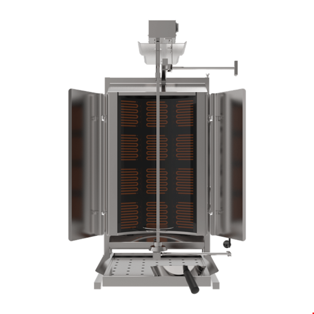 تجهيزات طهي متجانسة في وقت قصير بفضل سخانات تحيط بلحم الدونر بشكل دائري، وزجاج روبوكس عالي التوصيل موضوع أمام السخانات. تجهيزات طهي صحية وآمنة مع زجاج روباكس المقاوم لدرجات الحرارة العالية يمنع انسكاب الدهون على السخانات.